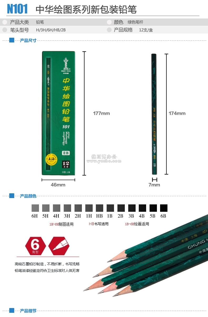 > 办公用品 > 书写工具 > 铅笔 > 中华铅笔 绘图木制铅笔 绘图铅笔101-2B~6B
