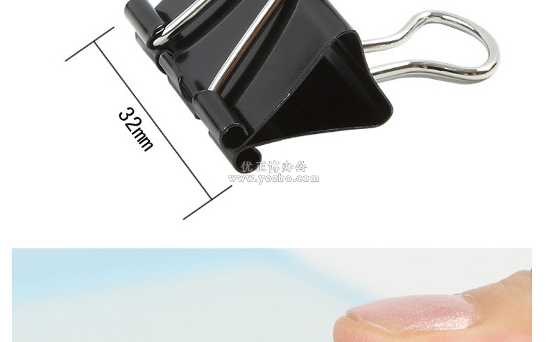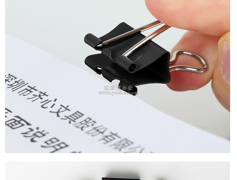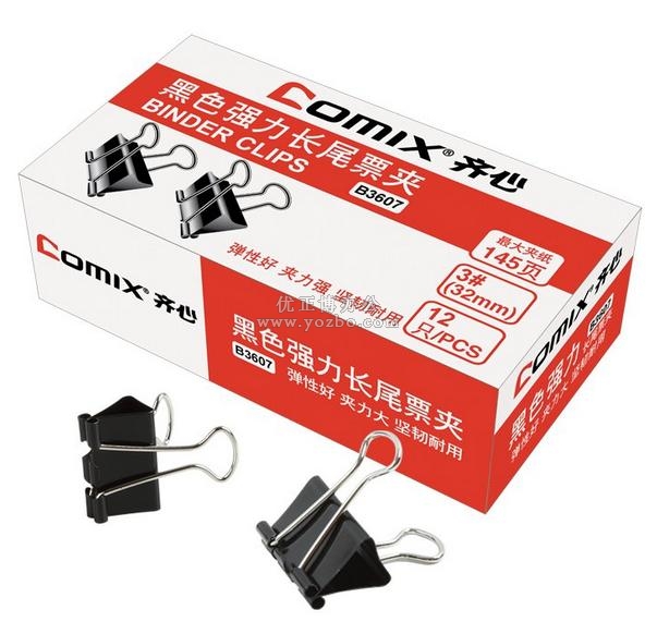 齐心B3607 黑色强力长尾票夹(3#,145页,盒装) ★高强度夹力,反复使用不松弛; ★金属涂层,防锈更显著; ★经济实惠,环保,使用频率最高的长尾夹; ★规格:32mm(3#),最大夹纸145页,12只/盒;