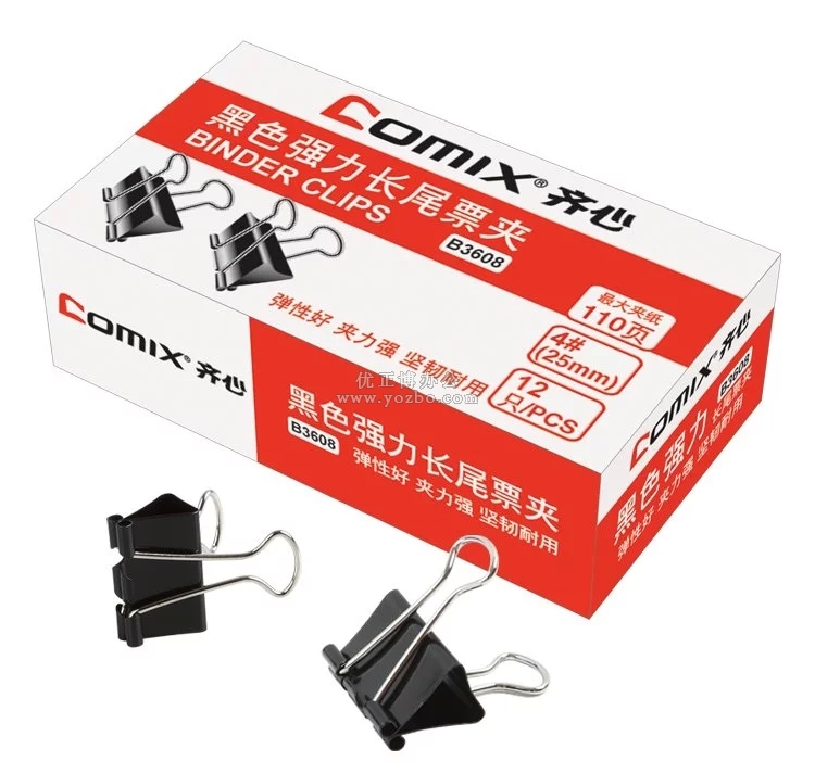 齐心B3608 黑色强力长尾票夹(4#,110页,盒装) ★高强度夹力,反复使用不松弛; ★金属涂层,防锈更显著; ★经济实惠,环保,使用频率最高的长尾夹; ★规格:25mm(4#),最大夹纸110页,12只/盒;