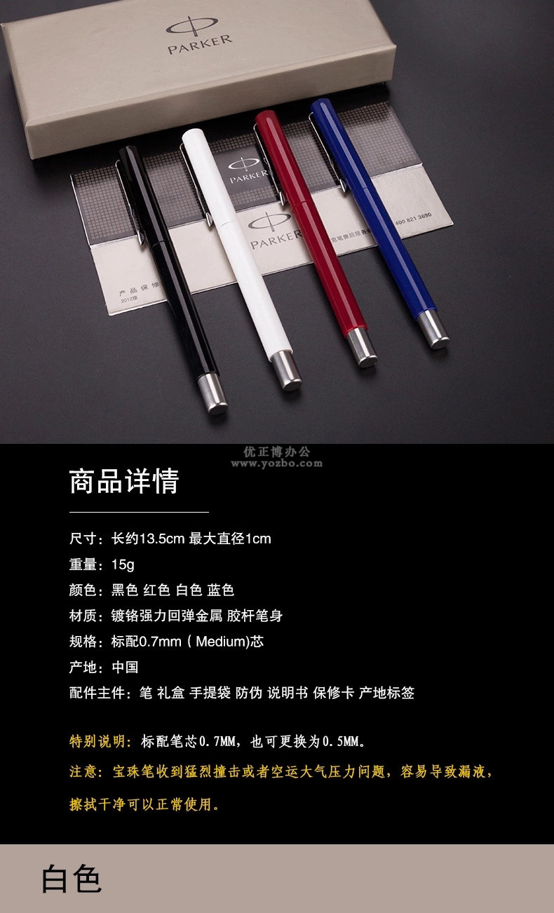 3、宝珠笔就是我们常说的签字笔。此笔原配一支派克笔芯,其型号为M(约0.7MM),可替换笔芯使用。可另行购买更细的F(0.5MM)使用。